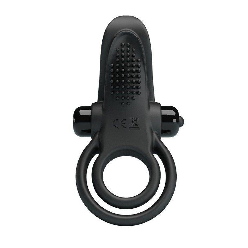 Anillo vibrador DOBLE ANILLO (pene y testículos) de silicona negra flexible con una gran lengua estriada y suave. Medidas generales: 11,3 x 5,6 cm.