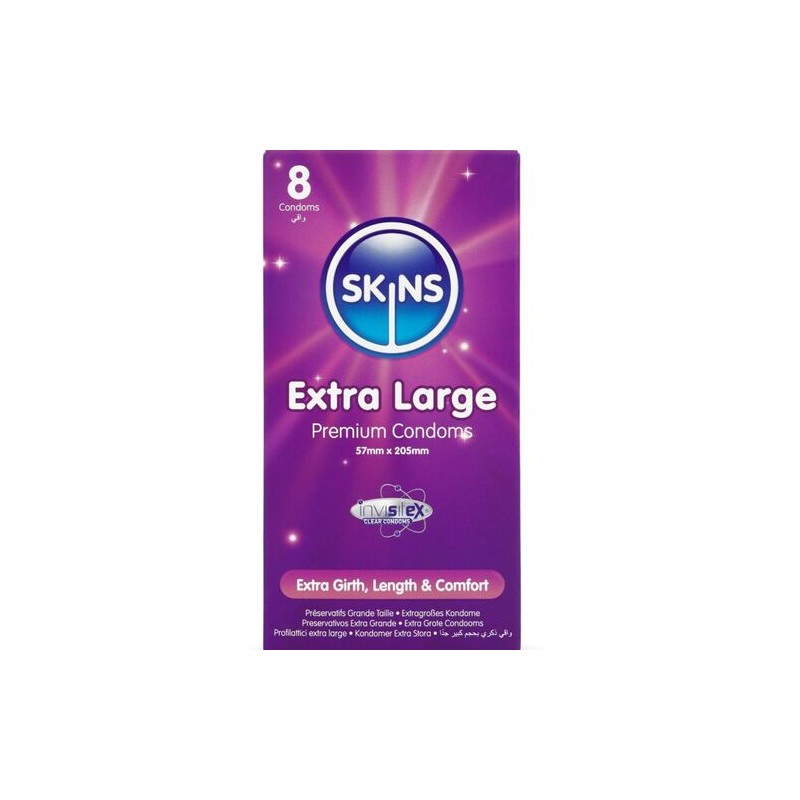 Caja de 8 condones de la marca Skins -holandesa- de tamaño XL. 57mm de ancho nominal. 205mm de largo y 60 micras de espesor.
