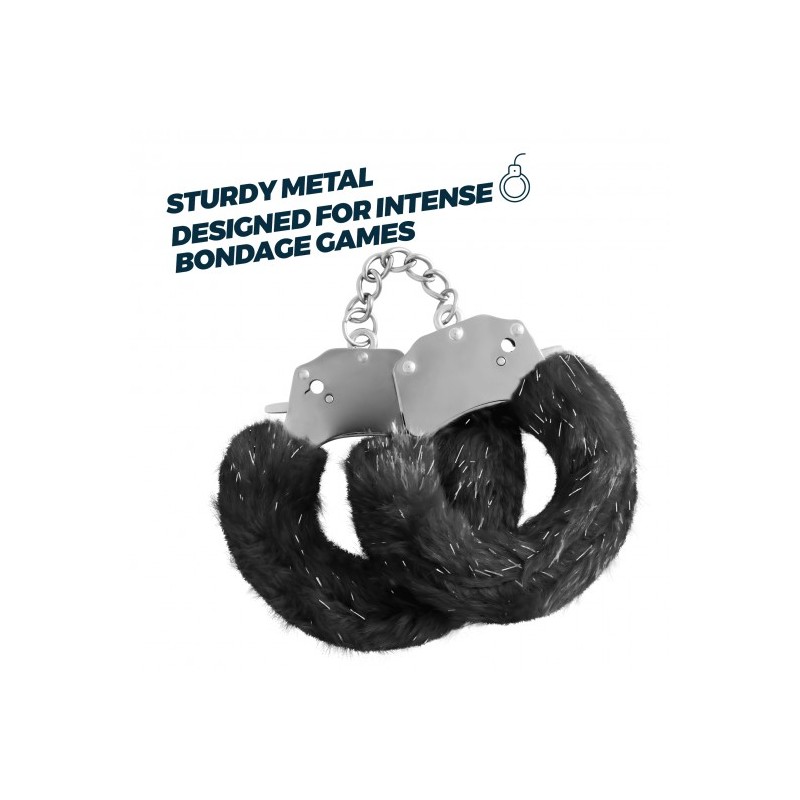 Esposas de metal, mejor calidad y más pesadas (133 gramos), recurbiertas de peluche con detalles brillantes en negro.