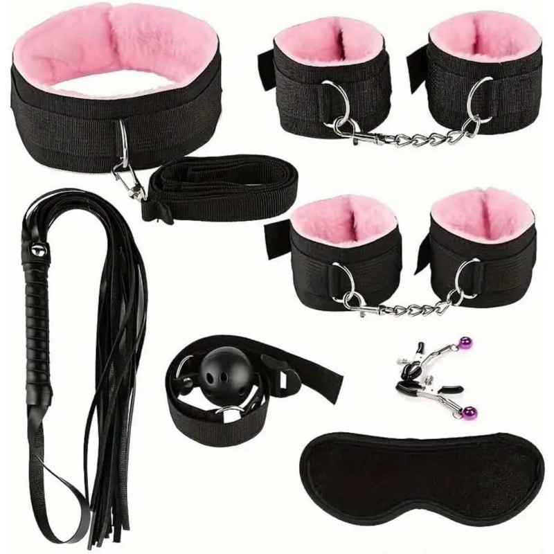 Set Bondage de 8 piezas: Collar, Correa, Esposas Manos, Esposas Tobillos, Gag, Latigo, Venda y Pinzas Pezones