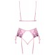 Suave conjunto de sujetador, liguero y tanga fabricado íntegramente en fino powernet rosado con bordados florales tono sobre tono. Presentado en caja talla S/M (no incluye medias)