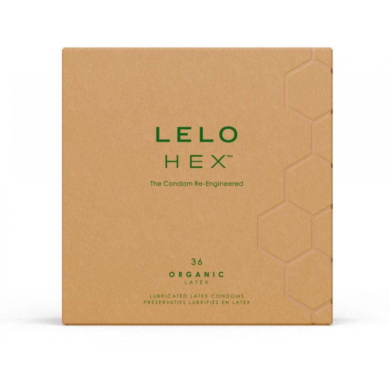 Caja de 36 unidades HEX original. Condón con arginina para estimular y sentir más y látex orgánico. Cuenta con 350 hexágonos con textura interna