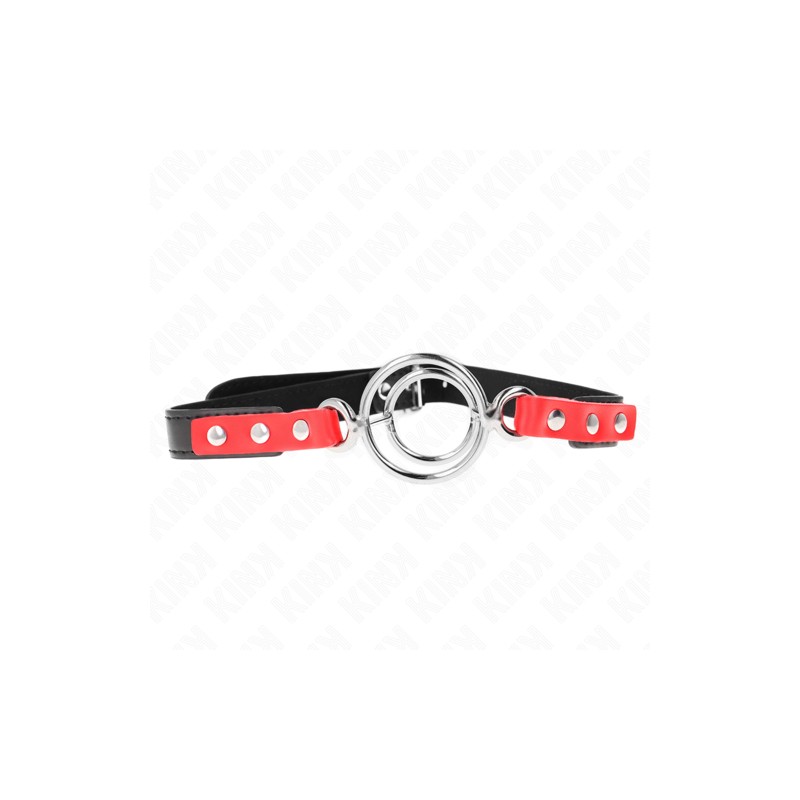 Mordaza de cuero vegano con hebilla y dos colores negro/rojo con aros unidos. Presentado en bolsa.